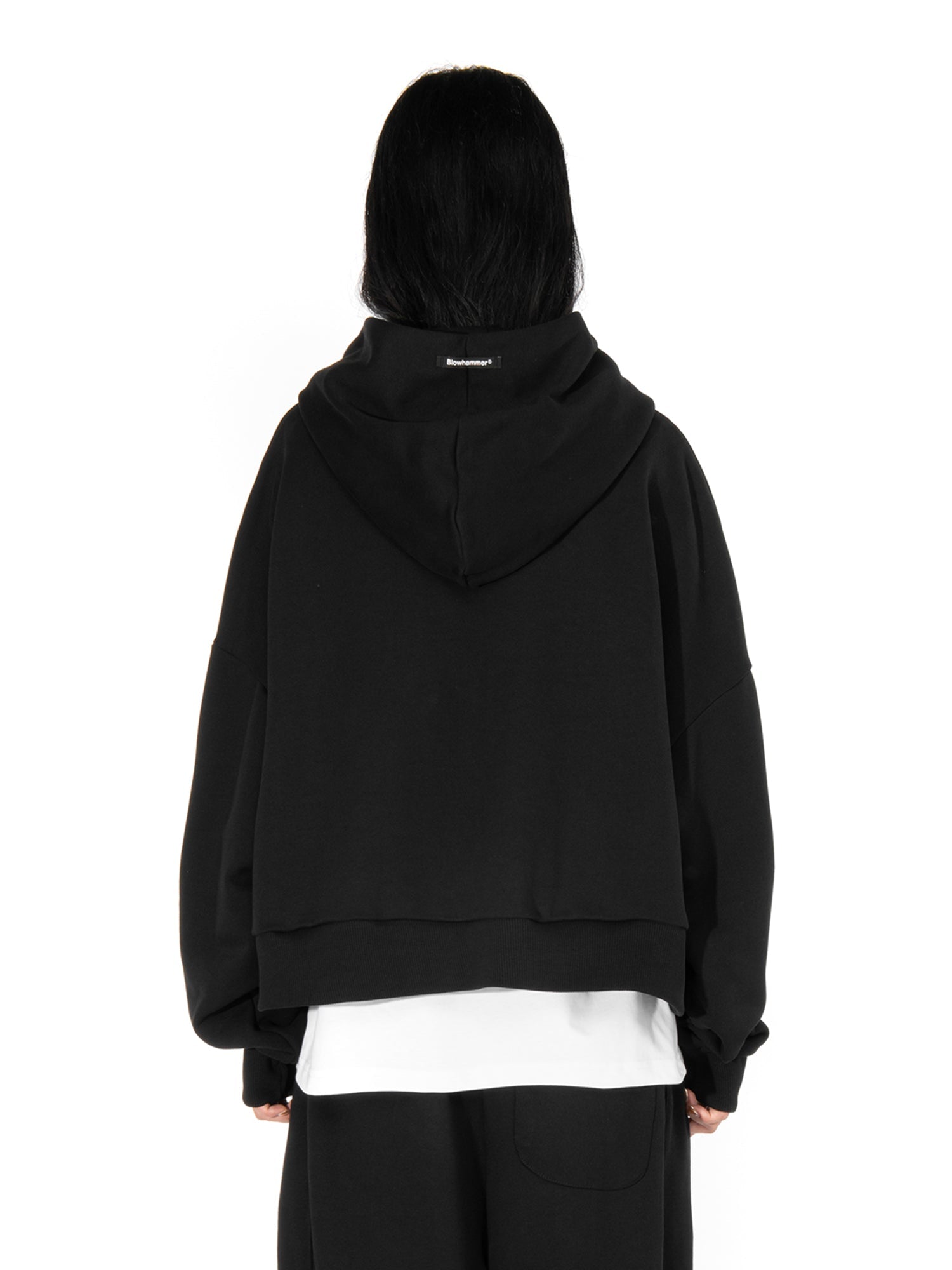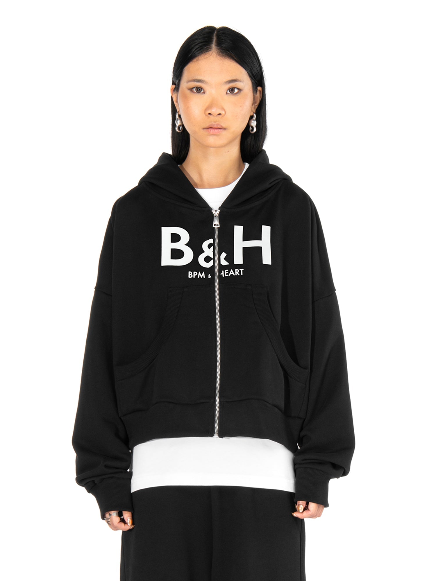 Cappuccio, maniche lunghe, chiusura frontale con Zip, due tasche laterali. Stampa Digitale "B&H". Etichetta applicata.