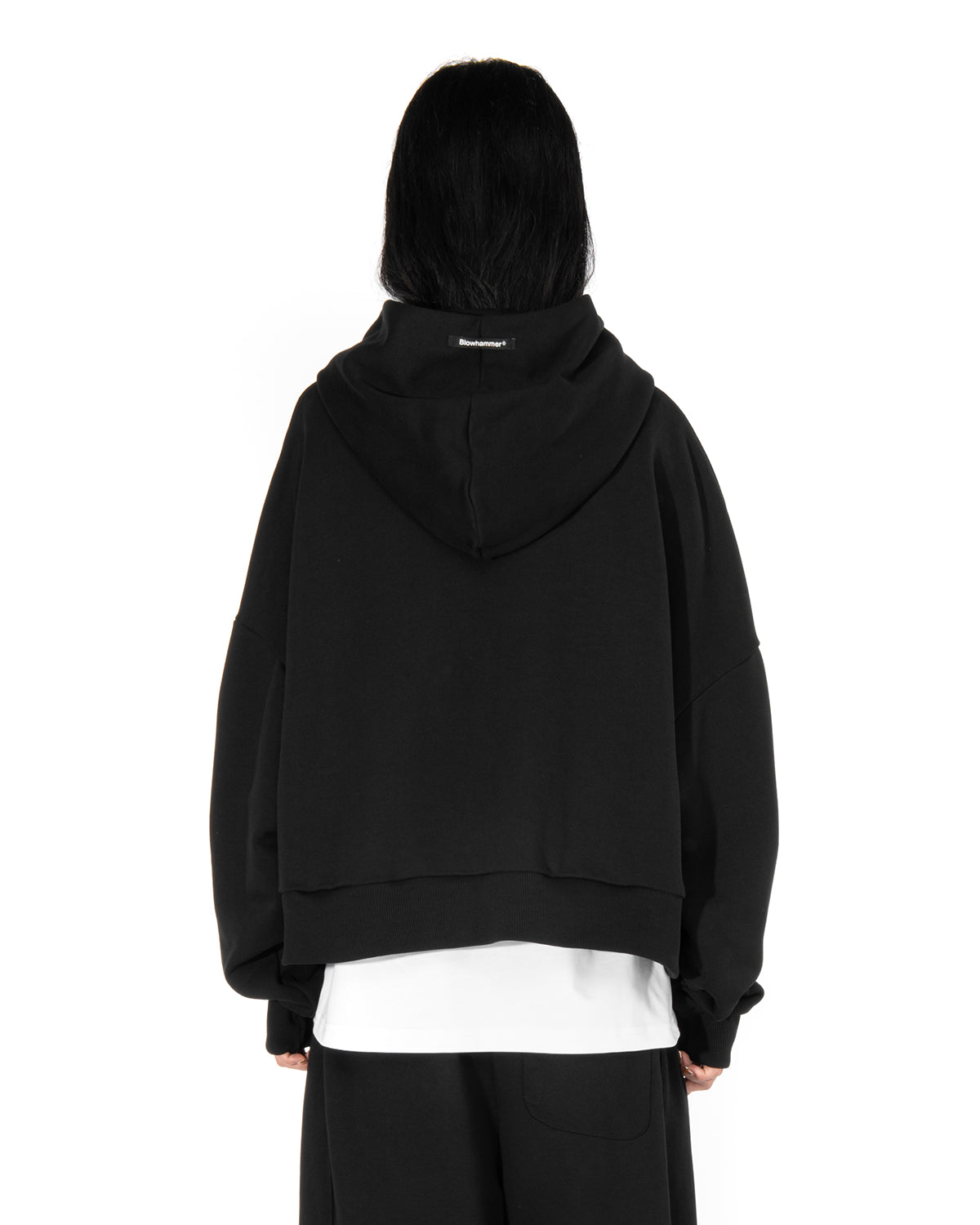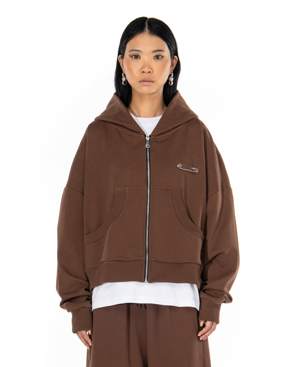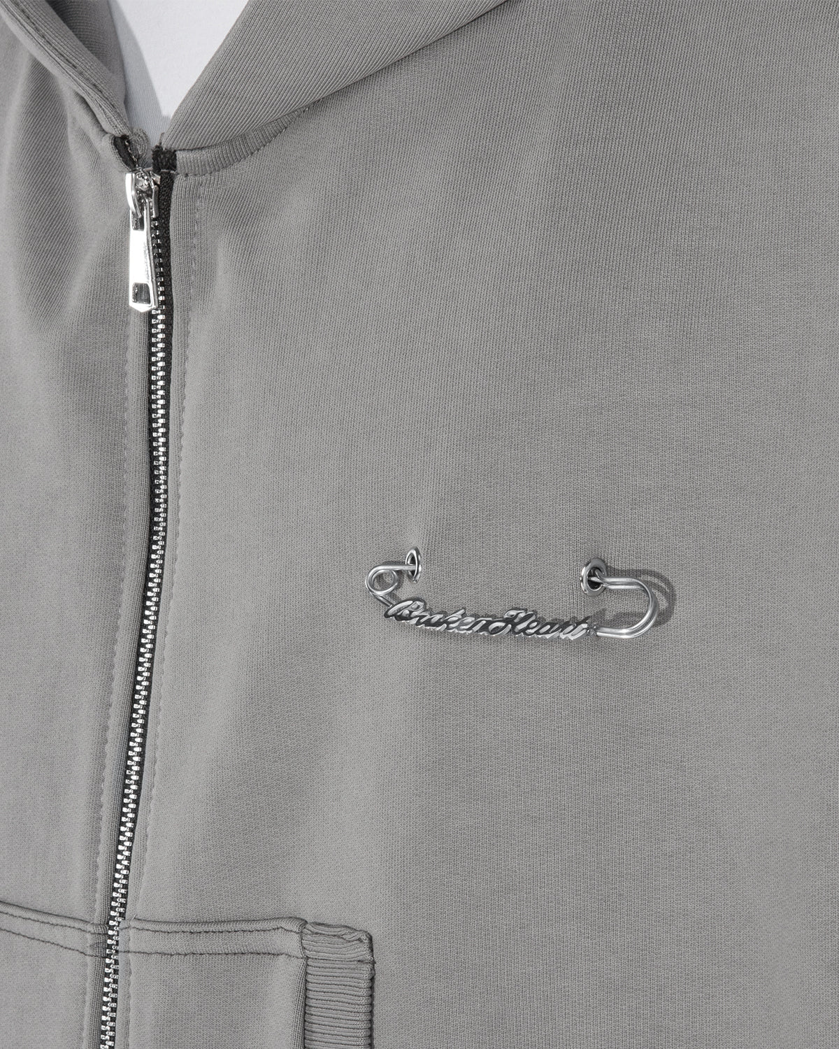 Cappuccio, maniche lunghe, chiusura frontale con Zip, due tasche laterali. Spilla "BROKENHEART ". Etichetta applicata.