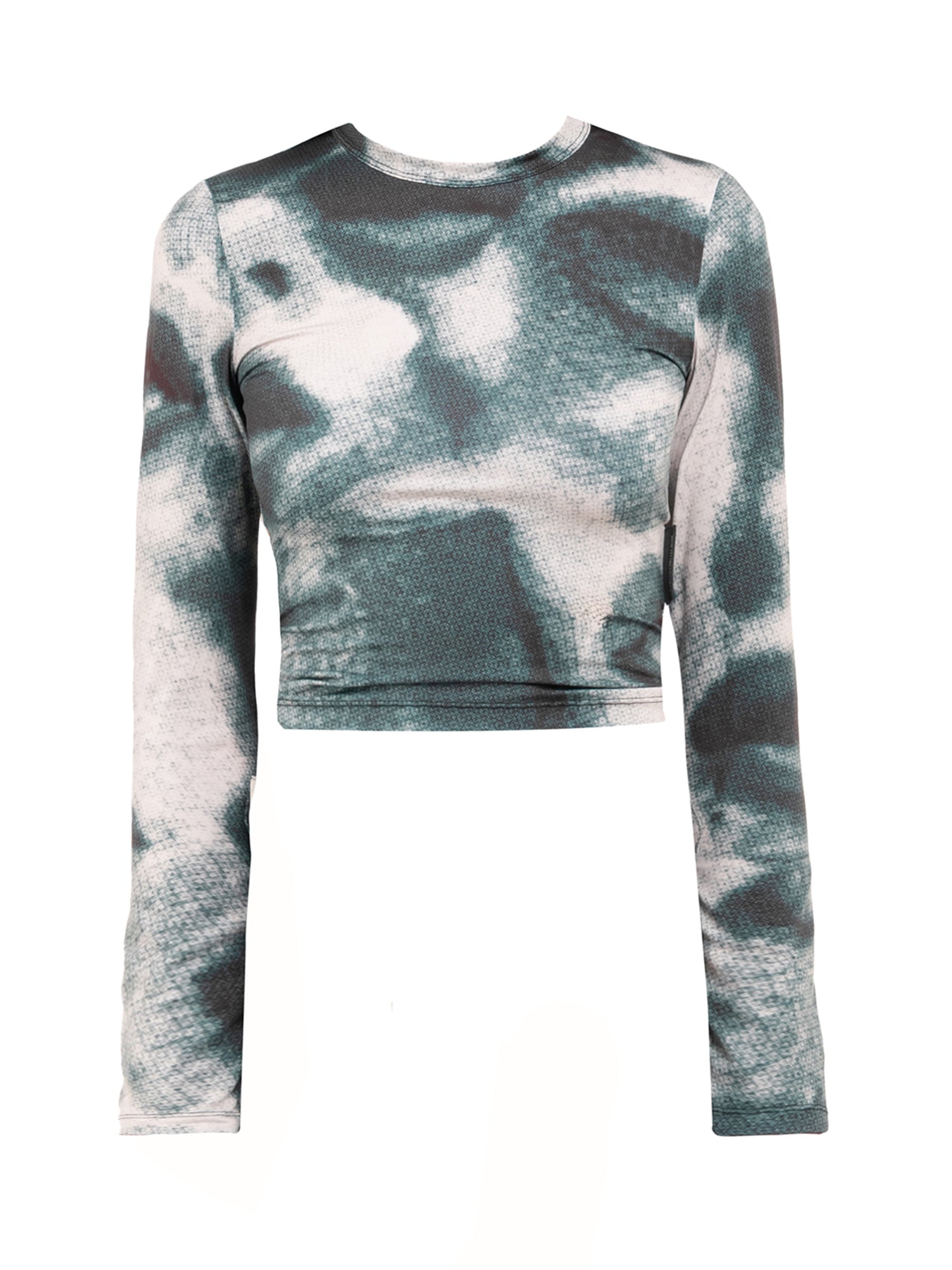 Girocollo. Maniche lunghe. Stampa a sublimazione. Etichetta applicata. Crop.
