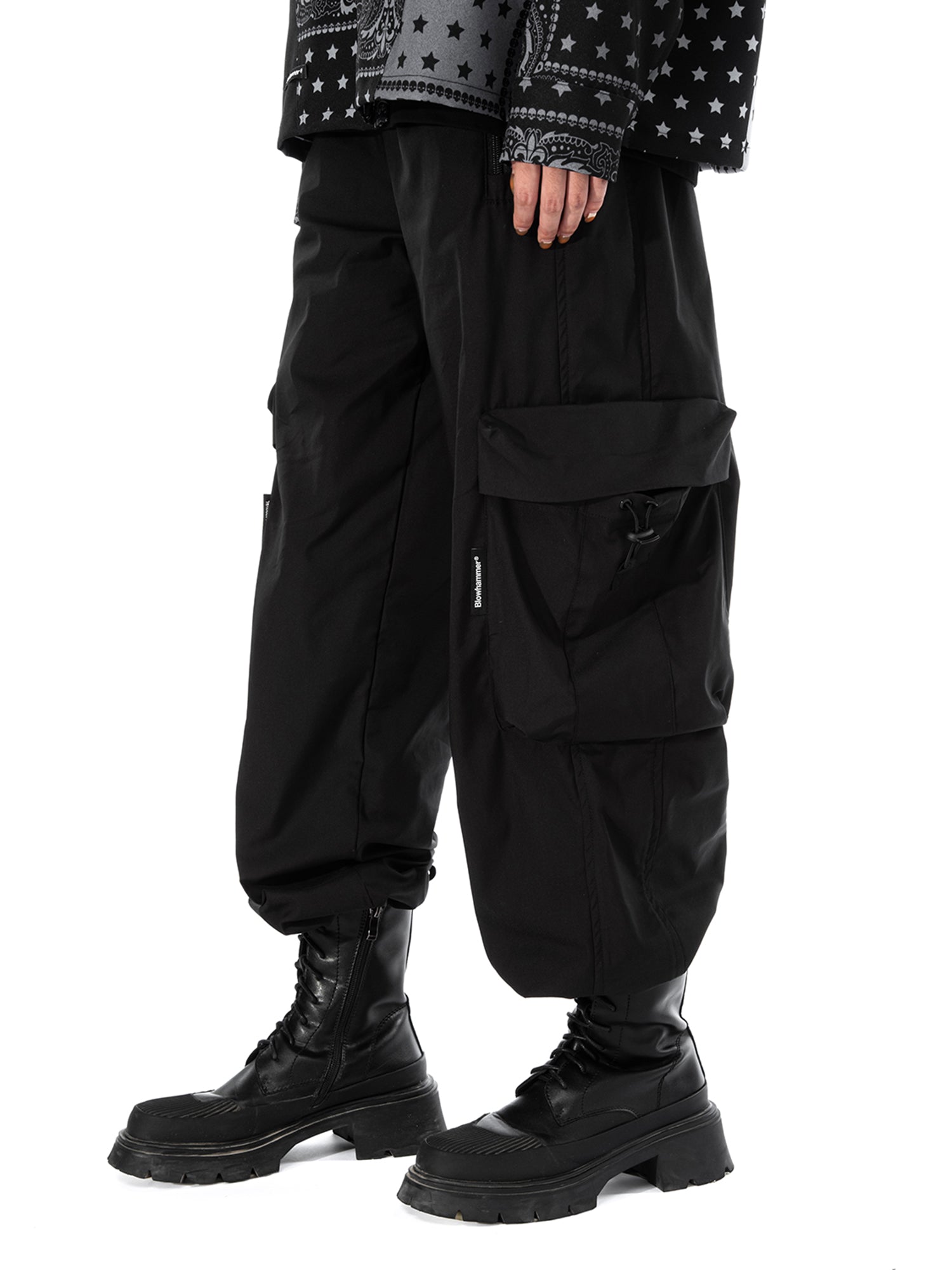 Vita elasticizzata regolabile. Tasche laterali con zip. Tasconi sulle gambe con stopper. Orlo regolabile alla caviglia. Etichetta applicata.