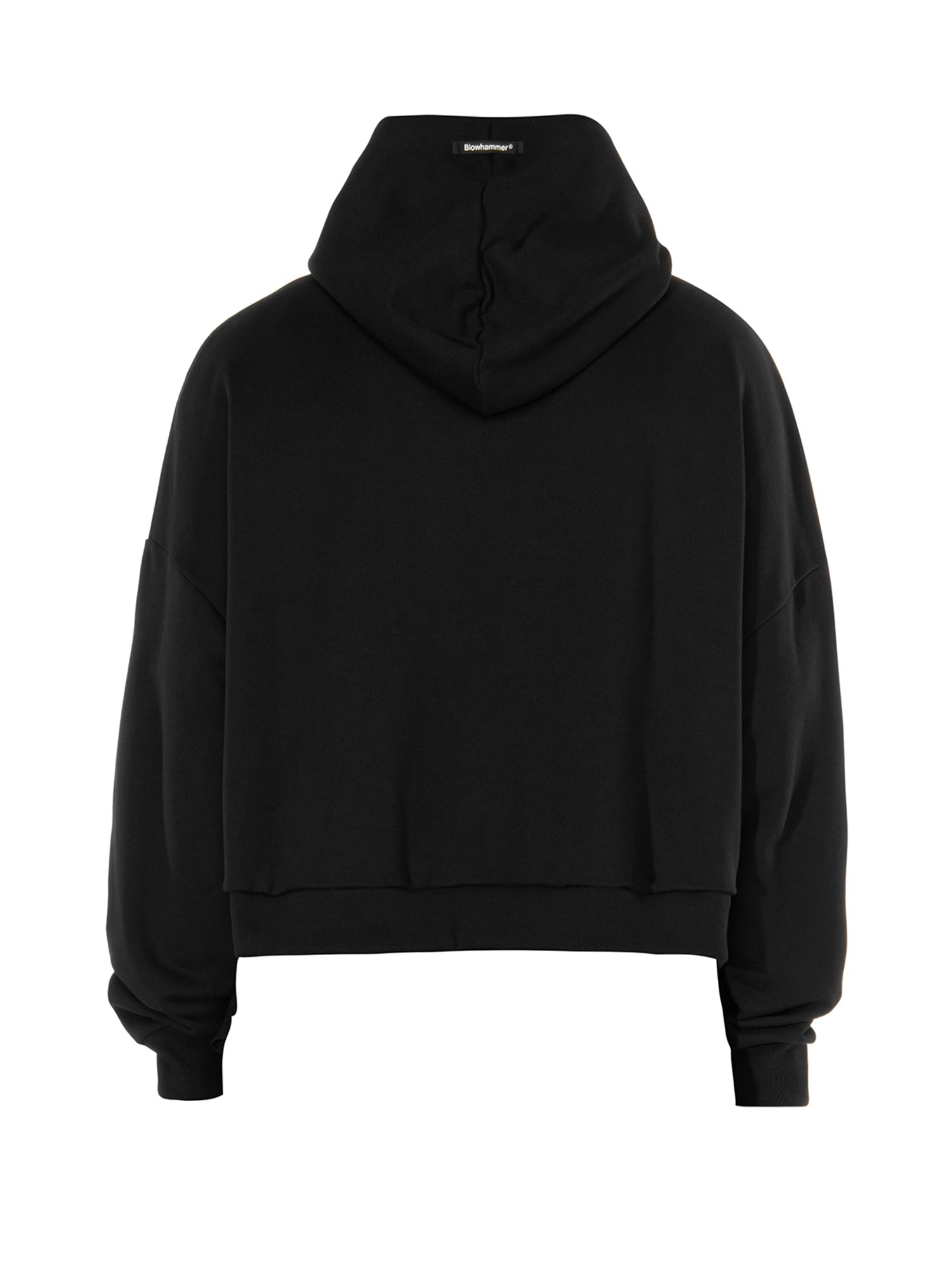 Cappuccio, maniche lunghe, chiusura frontale con Zip, due tasche laterali. Ricamo "L'amore sempre". Etichetta applicata.
