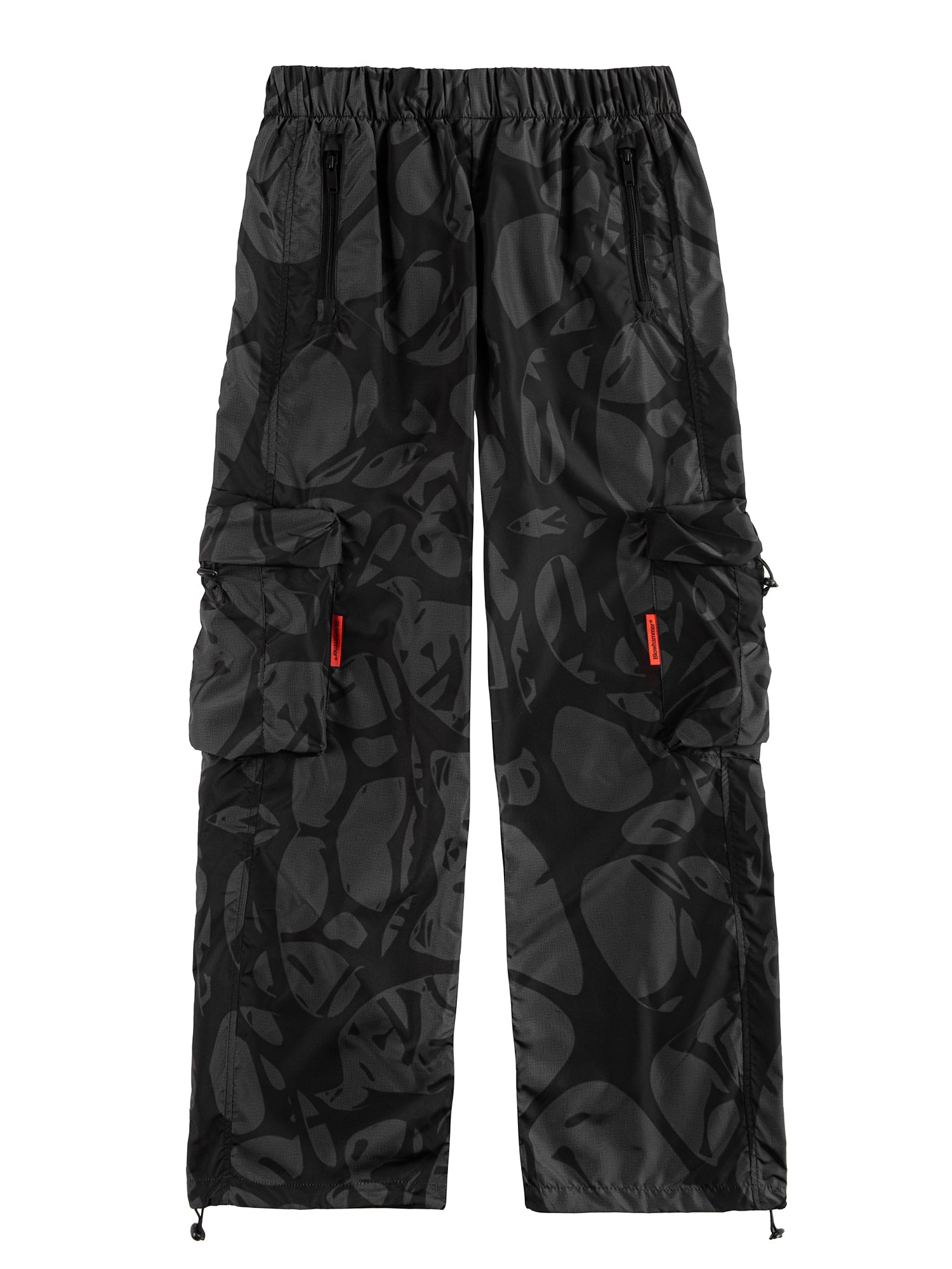 Vita elasticizzata regolabile. Tasche laterali con zip. Tasconi sulle gambe con stopper. Orlo regolabile alla caviglia. Stampa a sublimazione ed Etichetta applicata.
