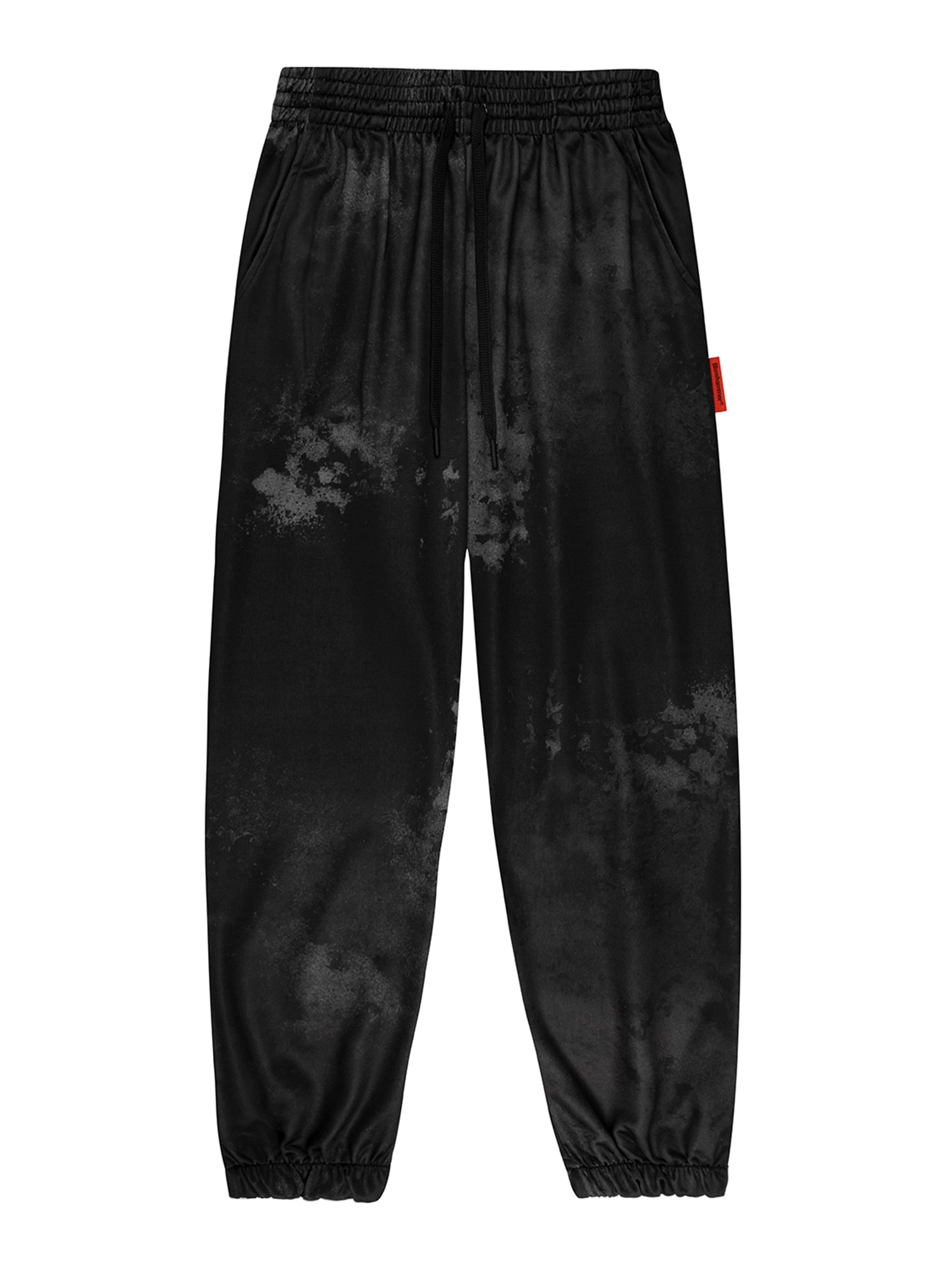 Vita elasticizzata con coulisse. Tasche laterali. Orlo con polsino elastico. Stampa a sublimazione ed Etichetta applicata.