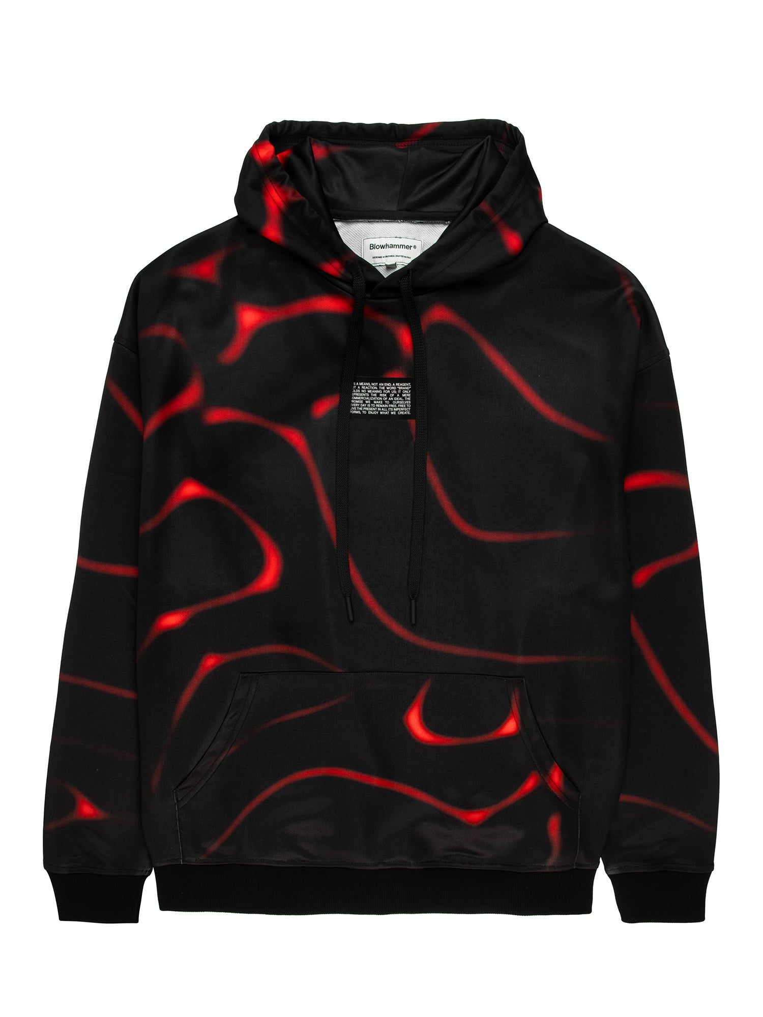 Cappuccio regolabile con laccio. Tasca canguro. Finiture a coste. Stampa a sublimazione ed Etichetta applicata.