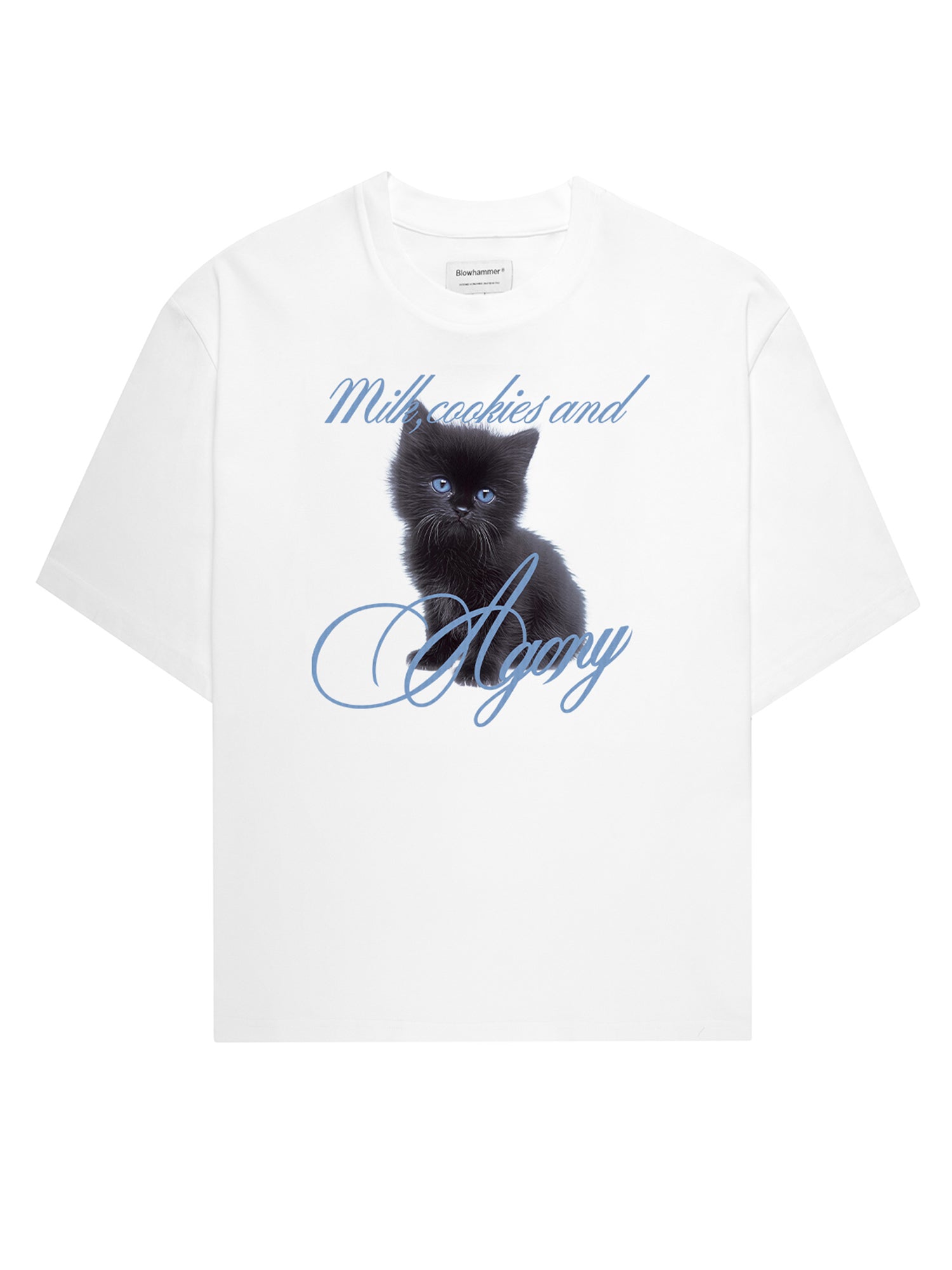 Crew neck. Short sleeves. Digital print: "Milk, Cookies and Agony".