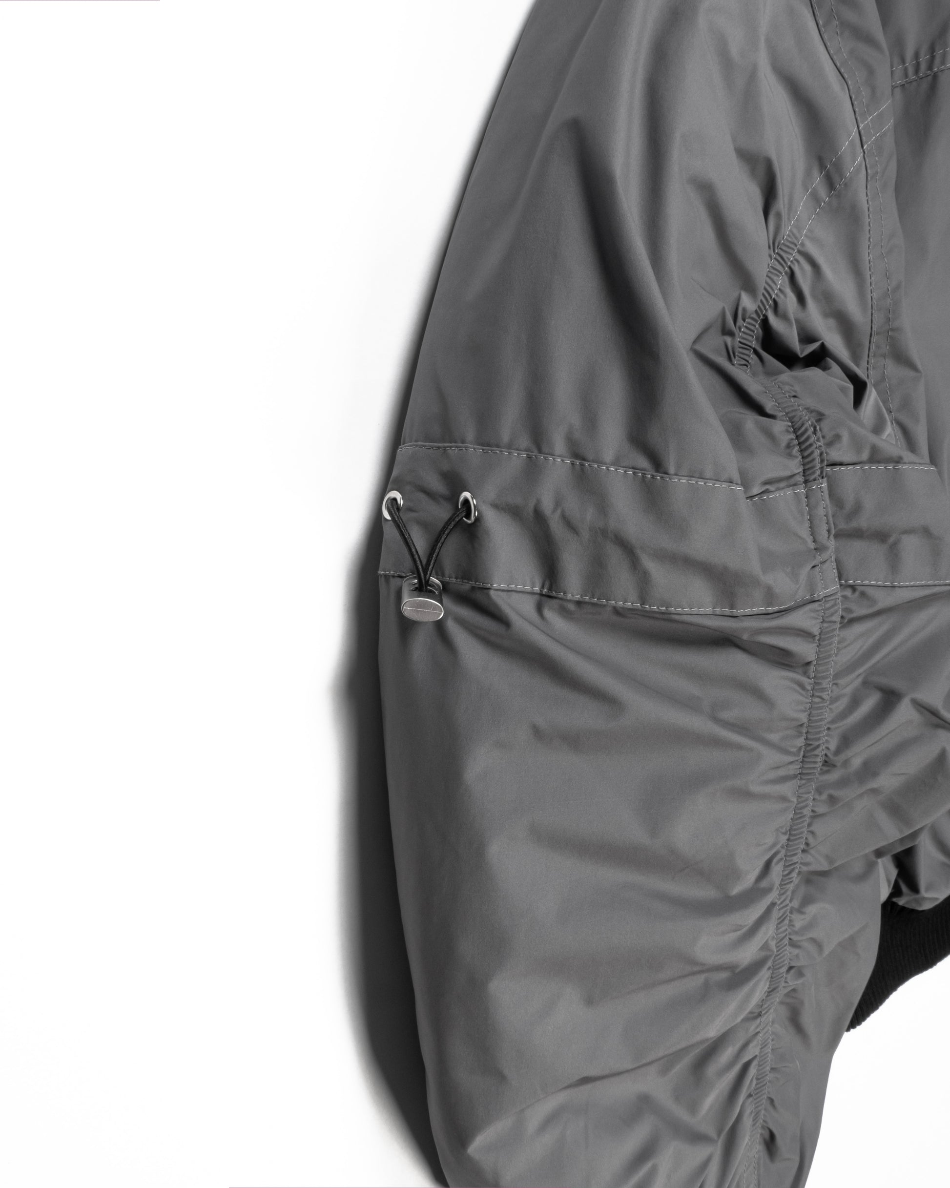 Ribbed collar. Long sleeves with gathered details. Concealed front closure. Two front flap pockets. Ribbed cuffs and hem. Shoulder details. Fully lined. Lightweight padding.